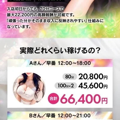 業界最高水準の報酬設定で、入店初日から80分でも最大18,000円の高額報酬が発生します。