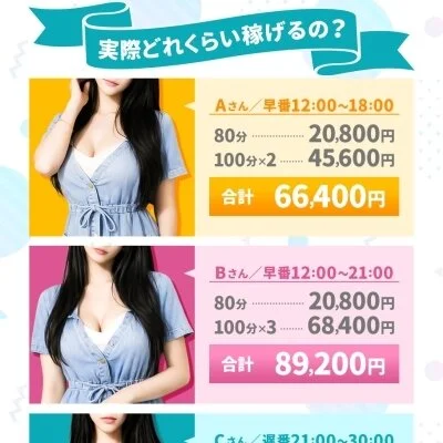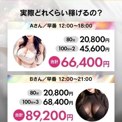 業界最高水準の報酬設定で、入店初日から80分でも最大18,000円の高額報酬が発生します。