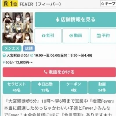 「集客力がちゃんとしているお店で働きたい!」「効率よく高収入を狙えるお店はないのかな?」と悩んでいる方、大宮・池袋『Fever』を是非ご覧ください!当店は、これまで培ったノウハウでエリア屈指の集客率をキープする人気メンズエステ☆大宮駅・池袋駅から徒歩5分程度の場所にあるから、出勤もラクラクなのではないでしょうか?