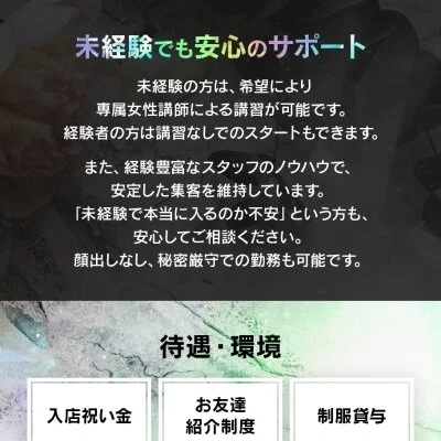 未経験の女の子でも安心してお仕事して頂けるように、充実したサポート体制を整えております♪