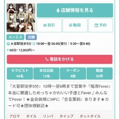 「集客力がちゃんとしているお店で働きたい!」「効率よく高収入を狙えるお店はないのかな?」と悩んでいる方、大宮・池袋『Fever』を是非ご覧ください!当店は、これまで培ったノウハウでエリア屈指の集客率をキープする人気メンズエステ☆大宮駅・池袋駅から徒歩5分程度の場所にあるから、出勤もラクラクなのではないでしょうか?