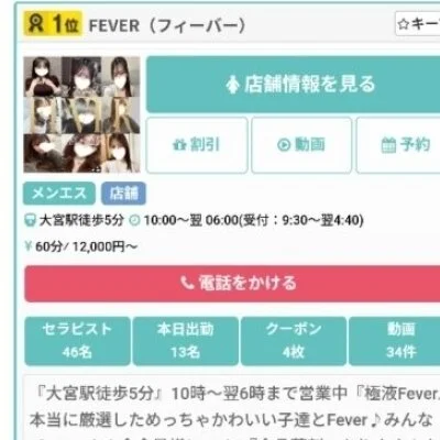 「集客力がちゃんとしているお店で働きたい!」「効率よく高収入を狙えるお店はないのかな?」と悩んでいる方、大宮・池袋『Fever』を是非ご覧ください!当店は、これまで培ったノウハウでエリア屈指の集客率をキープする人気メンズエステ☆大宮駅・池袋駅から徒歩5分程度の場所にあるから、出勤もラクラクなのではないでしょうか?