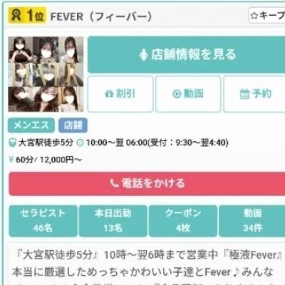 「集客力がちゃんとしているお店で働きたい!」「効率よく高収入を狙えるお店はないのかな?」と悩んでいる方、大宮・池袋『Fever』を是非ご覧ください!当店は、これまで培ったノウハウでエリア屈指の集客率をキープする人気メンズエステ☆大宮駅・池袋駅から徒歩5分程度の場所にあるから、出勤もラクラクなのではないでしょうか?