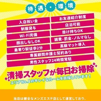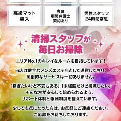 健全なメンズエステ店として運営してますので、脱ぐ・触られる・手コキ・舐めるなどの風俗的なサービスは一切ありませんのでご安心下さい。