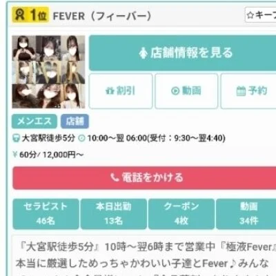 「集客力がちゃんとしているお店で働きたい!」「効率よく高収入を狙えるお店はないのかな?」と悩んでいる方、大宮・池袋『Fever』を是非ご覧ください!当店は、これまで培ったノウハウでエリア屈指の集客率をキープする人気メンズエステ☆大宮駅・池袋駅から徒歩5分程度の場所にあるから、出勤もラクラクなのではないでしょうか?