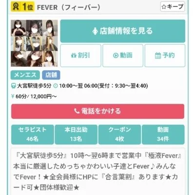 「集客力がちゃんとしているお店で働きたい!」「効率よく高収入を狙えるお店はないのかな?」と悩んでいる方、大宮・池袋『Fever』を是非ご覧ください!当店は、これまで培ったノウハウでエリア屈指の集客率をキープする人気メンズエステ☆大宮駅・池袋駅から徒歩5分程度の場所にあるから、出勤もラクラクなのではないでしょうか?