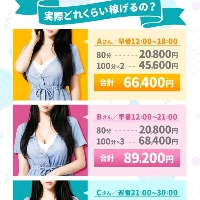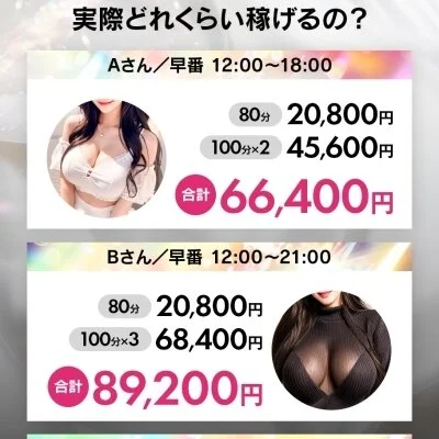 業界最高水準の報酬設定で、入店初日から80分でも最大18,000円の高額報酬が発生します。
