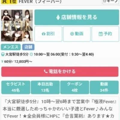 「集客力がちゃんとしているお店で働きたい!」「効率よく高収入を狙えるお店はないのかな?」と悩んでいる方、大宮・池袋『Fever』を是非ご覧ください!当店は、これまで培ったノウハウでエリア屈指の集客率をキープする人気メンズエステ☆大宮駅・池袋駅から徒歩5分程度の場所にあるから、出勤もラクラクなのではないでしょうか?