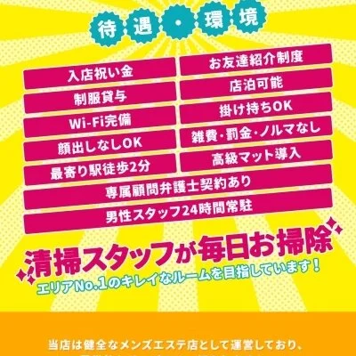 健全なメンズエステ店として運営してますので、脱ぐ・触られる・手コキ・舐めるなどの風俗的なサービスは一切ありませんのでご安心下さい。