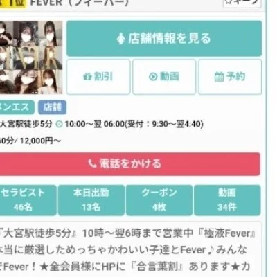 「集客力がちゃんとしているお店で働きたい!」「効率よく高収入を狙えるお店はないのかな?」と悩んでいる方、大宮・池袋『Fever』を是非ご覧ください!当店は、これまで培ったノウハウでエリア屈指の集客率をキープする人気メンズエステ☆大宮駅・池袋駅から徒歩5分程度の場所にあるから、出勤もラクラクなのではないでしょうか?