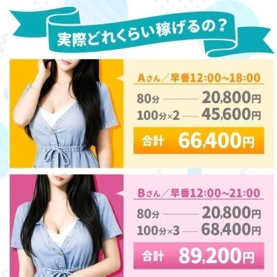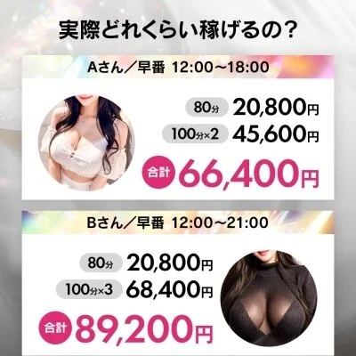 業界最高水準の報酬設定で、入店初日から80分でも最大18,000円の高額報酬が発生します。
