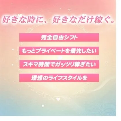 欲しかったものを手に入れたり、美容にこだわったり、大切な人にプレゼントをしたり…。経済的な自立は、貴女自身をさらに美しく、魅力的に変えてくれます。私たちは、そんな「輝いていく貴女」を全力でプロデュースします✨