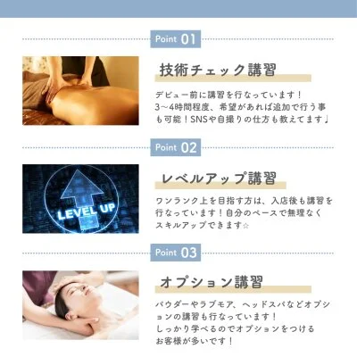 準備〜片付け、施術、接客マナーなどを